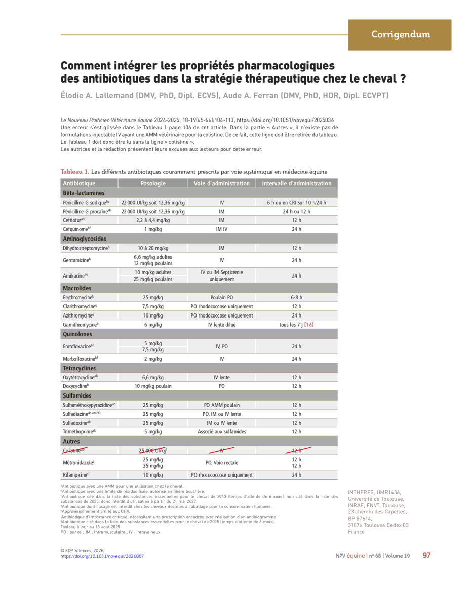 Corrigendum : Comment intégrer les propriétés pharmacologiques des antibiotiques dans la stratégie thérapeutique chez le cheval ?